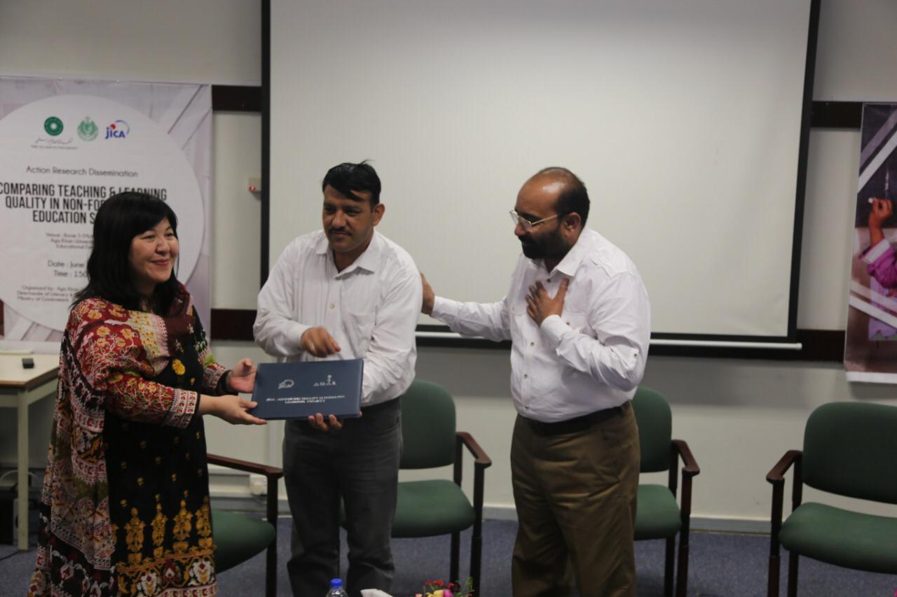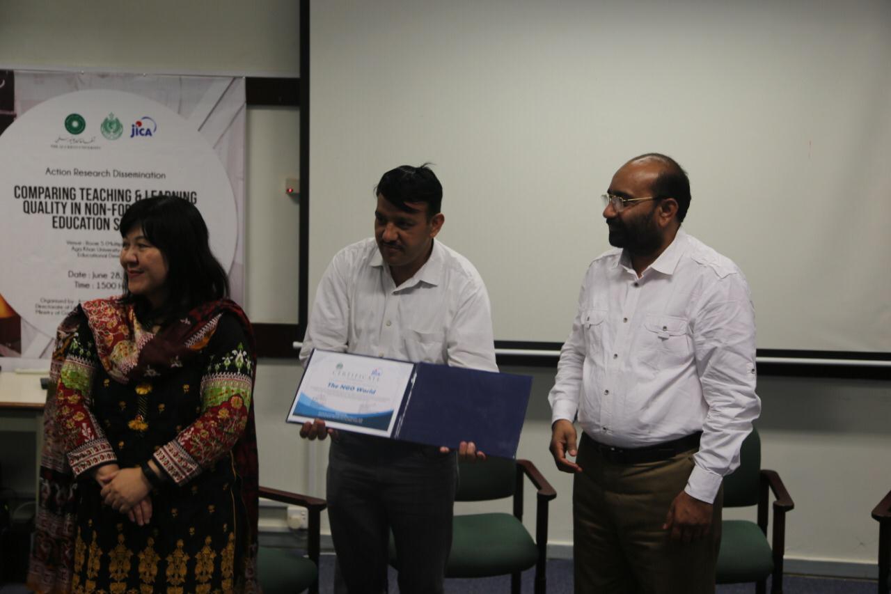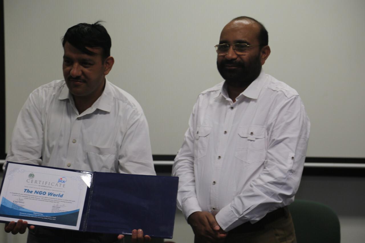 29 June 2019, Karachi: In appreciation of their efforts towards non-formal education and enrollment of out of school children, Directorate of Literacy and Non-formal Education, Sindh and Japan International Cooperation Agency (JICA) presented a certificate of appreciation to The NGO World Foundation during a seminar arranged in Agha Khan University Institute for Educational Development (AKU-IED) Karachi to disseminate findings of a year-long study which examined efficacy of non-formal basic education (NFBE) curriculum and materials for quality teaching and learning processes.