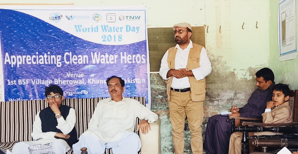 Mr. Zafar Iqbal, Executive Director, The NGO World, addressed the participants. He emphasized the importance of World Water Day. He gave orientation on SDG # 6, which refers to Clean Water & Sanitation. He told that Pakistan and other countries of the world agreed to work for the availability and access to clean water till 2030. It is our mutual and collective responsibility to not only safe water but makes resources and keep water safe. Clean water contributes our health and economic condition. He appreciated the community of Bherowal on having Pakistan’s first ever village to use the technology of Bio-Sand Water Filtration. Most of the population of Bherowal is benefiting from this technology. Mr. Zafar Iqbal, congratulate Mr. Irfan ul Haq of Waseb organization on working on this technology and provide clean drinking water to the community.
