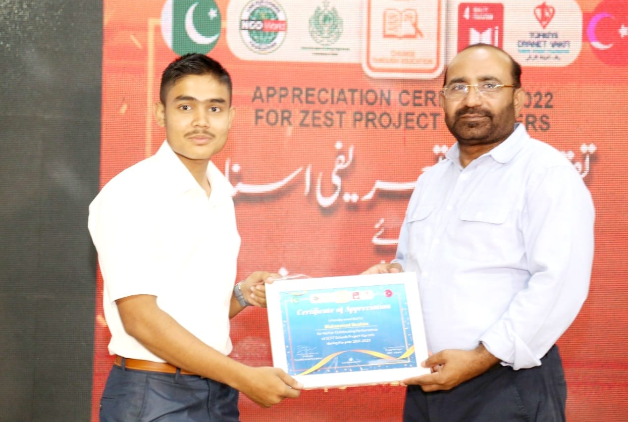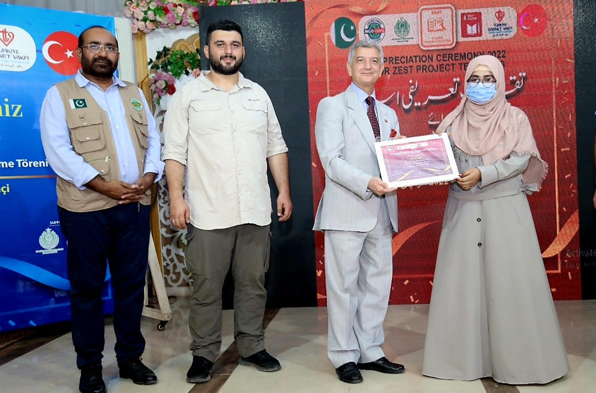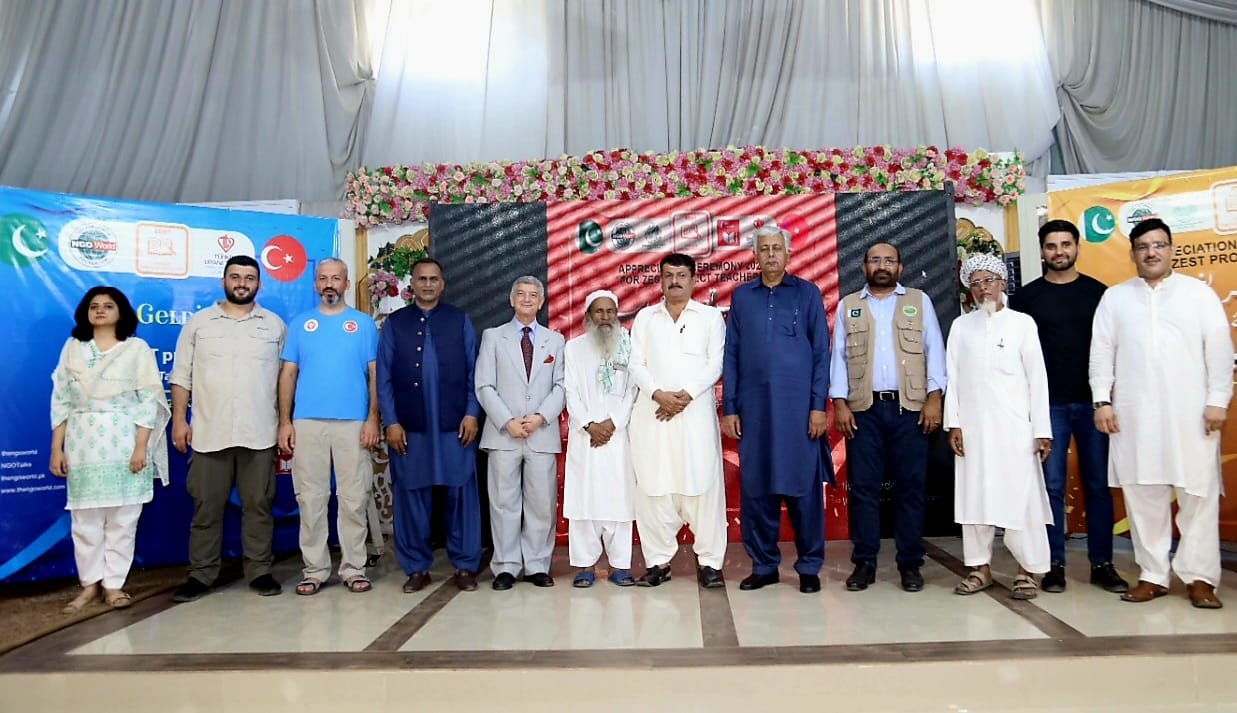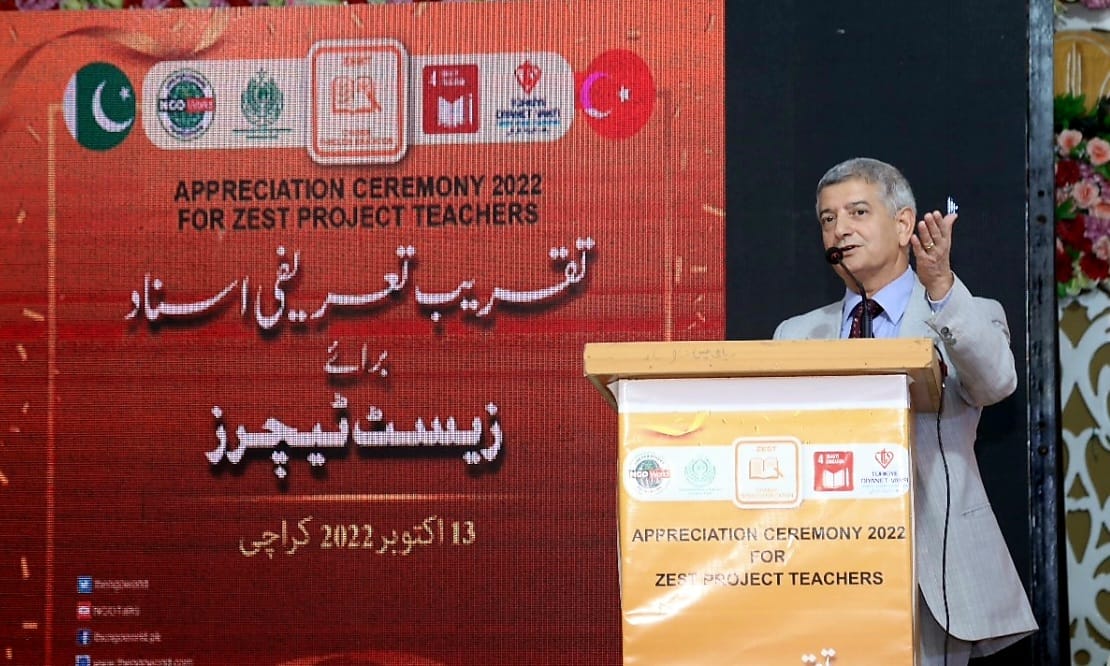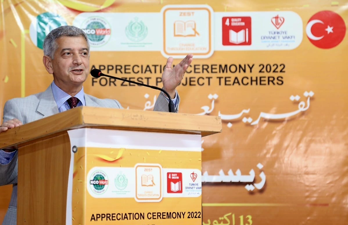 October 13, 2022; On invitation from Mr. Zafar Iqbal (chairman of The NGO World Founation), Consul General of Turkiye in Karachi, Mr. Cemal Sangu graced the ceremony organized to appreciate 200 teachers and staff of ZEST Education Project Karachi who are doing exceptional service of teaching out of school children through Nonformal Education. He said “Turkish organizations are supporting various projects in Pakistan but teaching the underserved children is the most valuable project”…. Mr. Cemal Sangu appreciated the hard-working teachers and delivered certificates to the high achievers. Representatives of Turkiye Diyanet Vakfi along with community members also participated in the program. Through this Project, The NGO World Foundation has targeted 10,000 out-of-school children to bring back to the Educational journey and it has become possible with coordination and cooperation from the Directorate of Literacy & Nonformal Education Government of Sindh and JICA Pakistan. Generous and continued support from Türkiye Diyanet Vakfı is one of the most important success factors.
